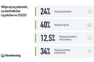 ClickMeeting podsumowuje 2025 r. w branży webinarów 2026-01-26Wydarzenia online stają się jednym z najskuteczniejszych narzędzi komercjalizacji wiedzy eksperckiej. W 2025 r. rekordowy cykl webinarów na...