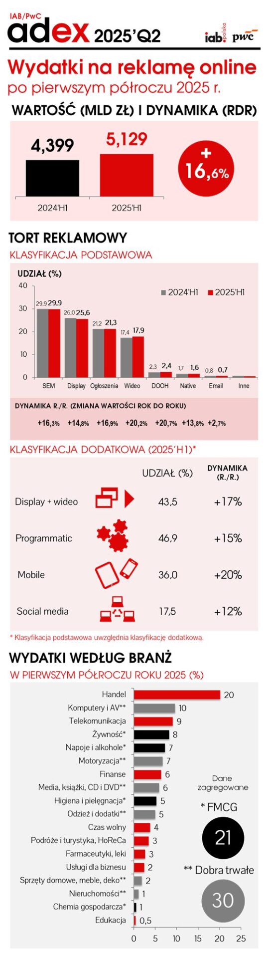 Jak pokazują wyniki badania wydatków na reklamę online AdEx IAB Polska/PwC za pierwsze półrocze 2025 r. rynek reklamowy online w Polsce osiągnął dynamikę wzrostu na poziomie 17%, a jego wartość osiągnęła 5,1 mld zł. Pełny raport w formie infografiki jest dostępny do pobrania.