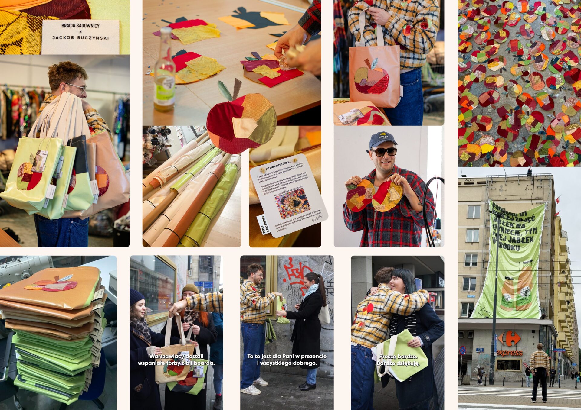 Po zakończonej kampanii, z wielkoformatowych reklam powstało 300 unikalnych toreb na zakupy (na przykład soków 😉 ) ozdobionych patchworkowymi aplikacjami jabłek.
