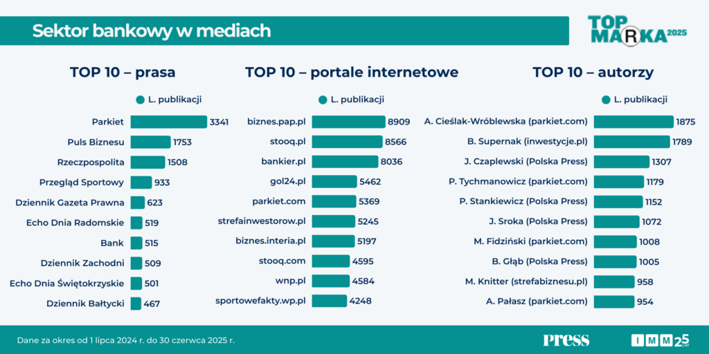 Największym polem dyskusji o polskiej bankowości były portale internetowe – to tam koncentrowała się znaczna część publikacji dotyczących sektora. Tematy podatkowe, stopy procentowe, wyniki kwartalne i zmiany właścicielskie były poruszane przede wszystkim w mediach ekonomicznych i biznesowych: w okresie objętym badaniem najaktywniejszym źródłem informacji okazał się Biznes.pap.pl, który opublikował 8909 materiałów o bankach; na kolejnych miejscach znalazły się Stooq.pl (8566) oraz Bankier.pl (8036). W prasie najczęściej o bankach pisały redakcje „Parkietu”, „Pulsu Biznesu” i „Rzeczpospolitej”.