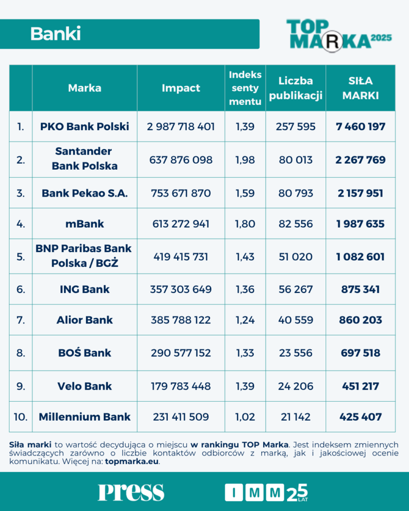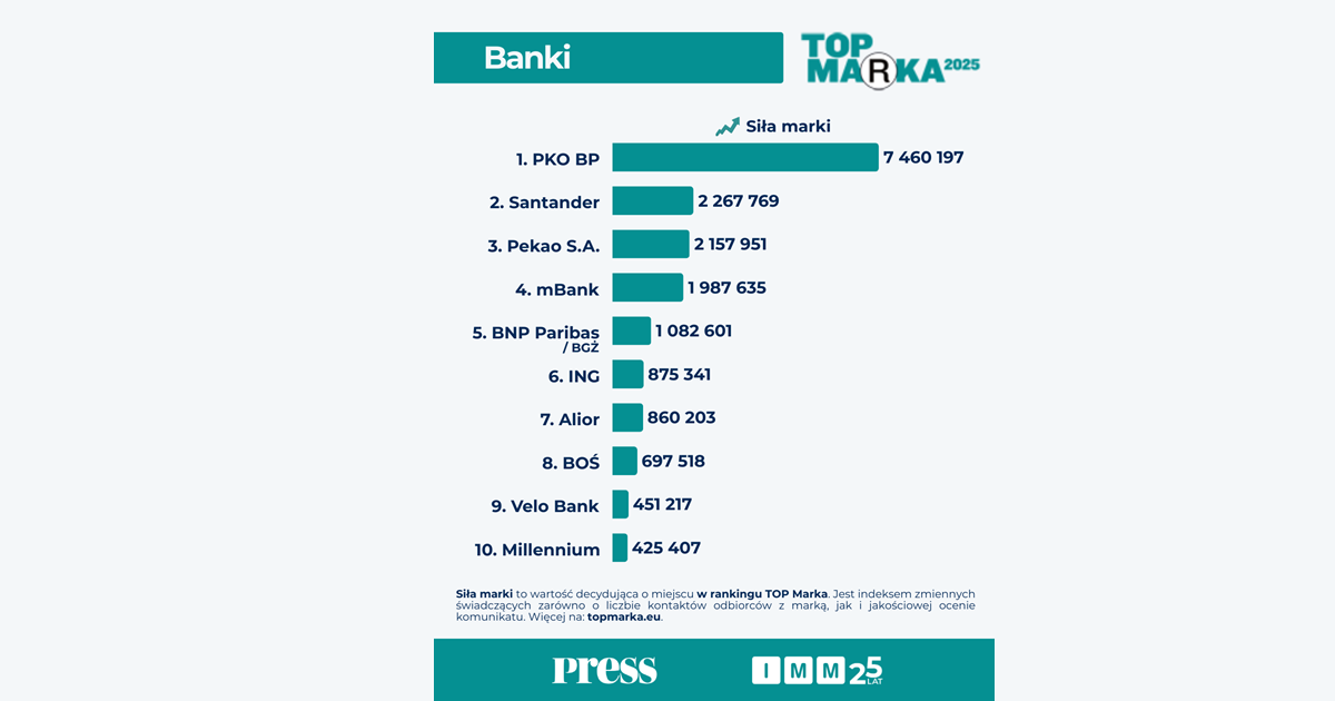 PKO Bank Polski, Santander Bank Polska i Bank Pekao to trzy najsilniejsze medialnie marki sektora bankowego w Polsce – wynika z najnowszej edycji badania Top Marka 2025, przygotowanego przez Instytut Monitorowania Mediów (IMM) i magazyn „Press”. W analizowanym okresie to dyskusje o rekordowych wynikach finansowych, wdrażaniu sztucznej inteligencji i bezpieczeństwie cyfrowym najmocniej wpływały na widoczność banków w badanych przekazach.