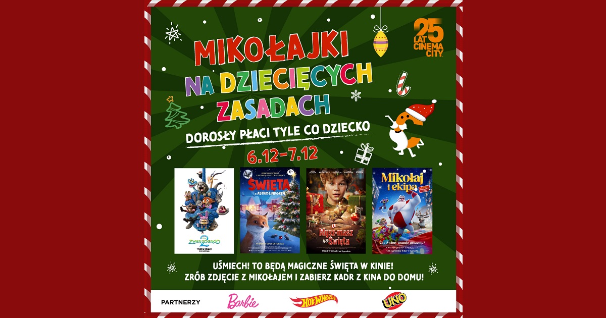 To jednak nie koniec niespodzianek! W związku ze zbliżającym się Bożym Narodzeniem Cinema City ogłasza wyjątkowy konkurs „Święta na dziecięcych zasadach”. Aby wziąć w nim udział, należy pomiędzy 6 a 21 grudnia odwiedzić wybrane kino Cinema City, wypełnić świąteczną deklarację, zaczynającą się od słów: Te święta spędzę na dziecięcych zasadach. Oto mój plan:… i wrzucić ją do specjalnego pudełka konkursowego. Spośród wszystkich zgłoszeń w każdym kinie wyłonione zostaną najciekawsze i najbardziej kreatywne odpowiedzi. Do wygrania: bilety rodzinne na seanse 2D do Cinema City, zestawy przekąsek w kinowym barze Cinema City, a także zabawki od partnera konkursu – marki Mattel: zestawy Hot Wheels, lalki Barbie oraz karty UNO. Rozstrzygnięcie konkursu nastąpi pomiędzy 22 a 31 grudnia. Z kolei nagrody odebrać będzie można przez cały styczeń.