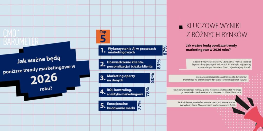 Warto jednak odnotować istotne różnice regionalne w ocenie kluczowych w 2026 roku trendów. W Szwajcarii, Francji i Wielkiej Brytanii AI dzieli podium z doświadczeniem klienta (customer experience), personalizacją i marketingiem opartym na ROI. Z kolei na Bliskim Wschodzie i (63%) i w Wielkiej Brytanii (62%) marketerzy wskazali, że kluczowym tematem pozostaje internacjonalizacja, co pokazuje, że presja na globalną ekspansję jest tam równie silna, co transformacja technologiczna.