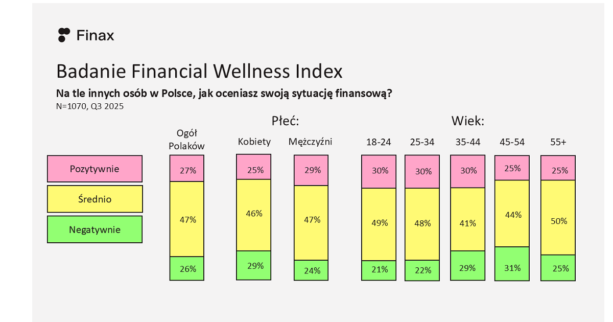 47% Polaków ocenia swoją sytuację finansową jako przeciętną. Zadowolonych jest 27% społeczeństwa, a niezadowolonych: 26%. Co piąty Polak (20%) dostrzega w ostatnich trzech miesiącach poprawę, wobec aż 41% osób, które są przeciwnego zdania. Mężczyźni są bardziej optymistyczni niż kobiety, a seniorzy – znacznie spokojniejsi niż młodzi. 30% kobiet przyznaje, że odczuwa wysoki stres finansowy (vs. 19% mężczyzn). Wśród osób 55+ brak stresu deklaruje ponad połowa badanych (51%), natomiast w grupie 25–34 lata – zaledwie 18%.