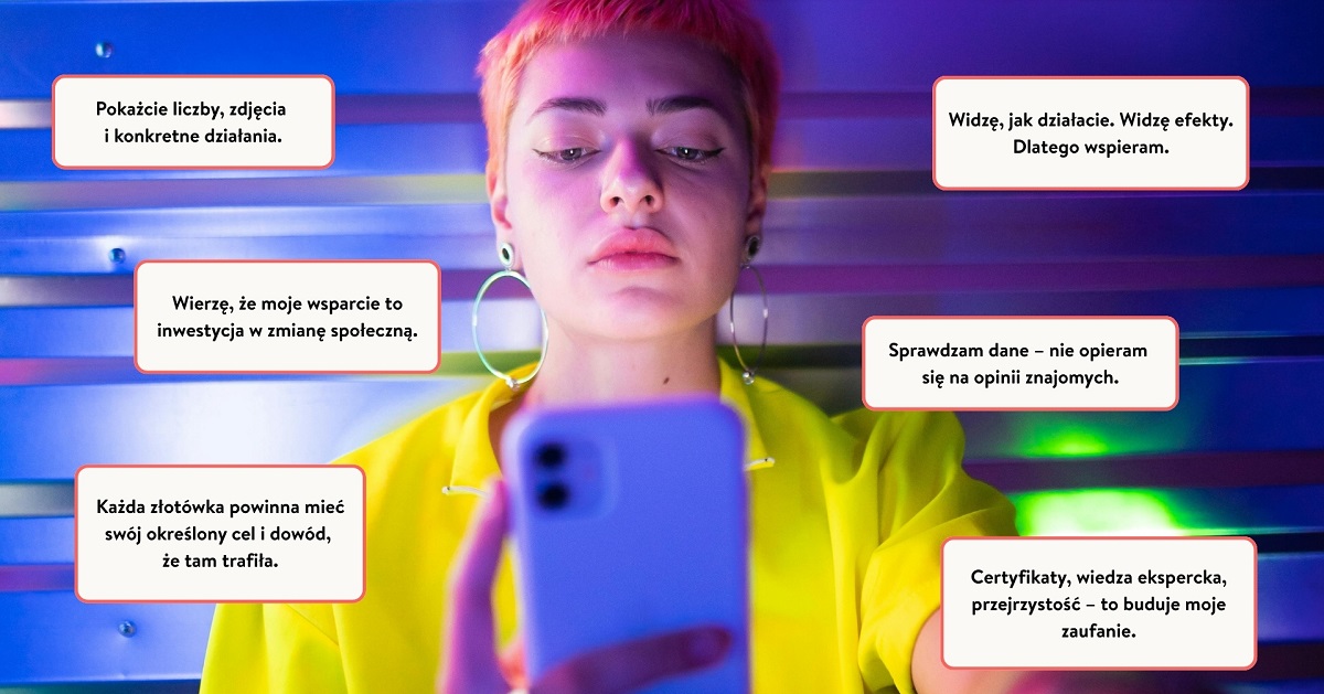 Pokolenie Z jest pragmatyczne i sceptyczne. Nie ufają autorytetom na słowo, a rekomendacja od znanej osoby to dla nich najmniej istotny czynnik. Zamiast tego chcą dowodów. Zaufanie organizacji zdobędzie się, pokazując im widoczne efekty działania w postaci konkretnych historii i relacji. Kluczowy jest też jasno określony cel zbiórki, dzięki któremu wiedzą, na co dokładnie idą ich pieniądze, a także pełna przejrzystość finansowa, potwierdzona publicznymi raportami z wydatków.