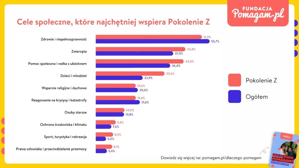Kiedy już decydują się otworzyć portfel, robią to w zgodzie ze swoimi wartościami. Około ośmiu na dziesięciu młodych deklaruje, że działania organizacji muszą być zgodne z ich światopoglądem. Najważniejsze dla nich są uniwersalne cele: zdrowie i pomoc osobom z niepełnosprawnością, zwierzęta oraz walka z ubóstwem. Jednak to, co wyróżnia ich na tle starszych pokoleń, to większe zaangażowanie w sprawy związane z prawami człowieka.