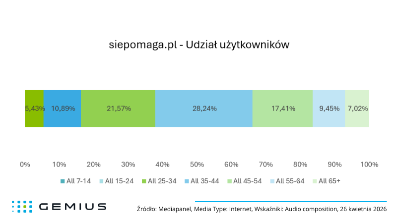 Analiza nadreprezentacji użytkowników pokazała, że najwyższe wartości wskaźnik Affinity Index osiągnął w grupie 25-34 lata. Ta grupa, stanowiąc 21,6% wszystkich odwiedzających, wykazała się najwyższym stopniem mobilizacji w stosunku do swojej ogólnej liczebności w populacji internautów.