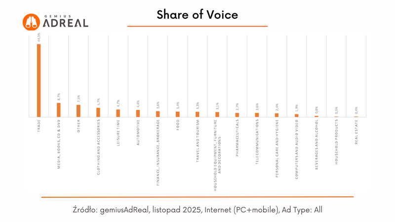 We wszystkich typach mediów najaktywniejsze reklamowo były marki z branży „Trade” – wynika z danych gemiusAdReal za listopad 2025.