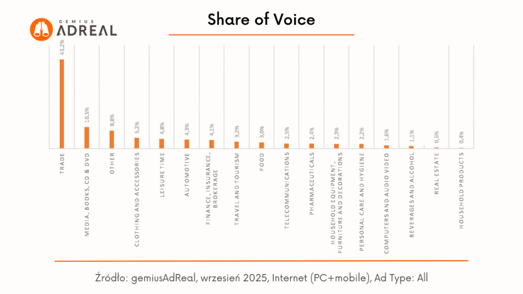We wszystkich typach mediów najaktywniejsze reklamowo były marki z branży „Trade” – wynika z danych gemiusAdReal za wrzesień 2025.