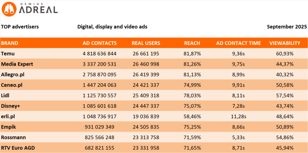 Najbardziej aktywnym reklamodawcą digital we wrześniu 2025 ponownie została marka Temu, która wygenerowała 4,8 mld kontaktów reklamowych online, docierając do 81,9% Polaków w wieku od 7 do 75 lat. Na drugim miejscu znalazł się Media Expert z 3,3 mld kontaktów i 81,3% zasięgu. Trzecie miejsce na podium należało do Allegro.pl (2,8 mld kontaktów i zasięg na poziomie 81,1%).