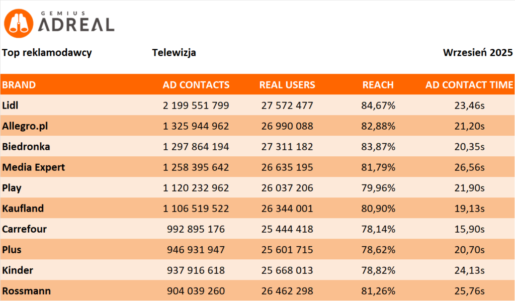 Najbardziej aktywnym reklamodawcą w telewizji we wrześniu była marka Lidl. Wygenerowała ona 2,2 mld kontaktów reklamowych, docierając do 84,7% Polaków w wieku od 7 do 75 lat. Na drugim miejscu znalazła się Allegro.pl (1,3 mld kontaktów reklamowych i 82,9% zasięgu), natomiast na trzecim – Biedronka (1,3 mld kontaktów i 83,87% zasięgu). Na 10. miejscu prezentowanego rankingu uplasowała się marka Rossmann z 0,9 mld kontaktów reklamowych i 81,3% zasięgu w populacji 7-75.