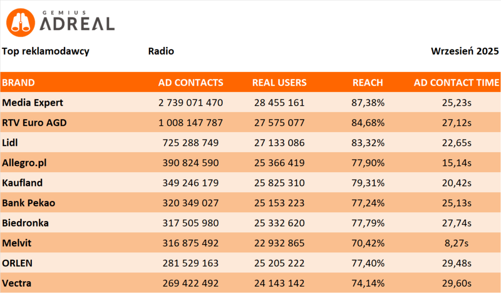 Najbardziej aktywnym reklamodawcą w radiu we wrześniu 2025 była marka Media Expert – wygenerowała ona 2,7 mld kontaktów reklamowych, docierając do 87,4% Polaków w wieku od 7 do 75 lat. Na drugim miejscu znalazło się RTV Euro AGD (1 mld kontaktów reklamowych, 84,7% zasięgu), na trzecim – Lidl (0,7 mld kontaktów, 83,3% zasięgu). Zestawienie TOP 10 zamyka marka Vectra (0,3 mld kontaktów i 74,1% zasięgu).