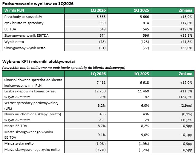 – Pierwszy kwartał 2026 roku potwierdził, że skutecznie łączymy dalszy wzrost skali działalności z dyscypliną kosztową, co pozostaje jednym z fundamentów realizowanej strategii finansowej. Kontynuowaliśmy optymalizację kosztów operacyjnych, w tym usprawnienia w logistyce oraz działania poprawiające efektywność energetyczną, co przełożyło się na wzrost marży skorygowanego wyniku EBITDA rok do roku. Pomimo sezonowo najmniej istotnego kwartału, negatywnego kapitału obrotowego i otwarcia aż 435 nowych sklepów, wygenerowaliśmy pozytywne przepływy pieniężne, co jest kolejnym dowodem na znakomitą zdolność generowania przepływów przez nasz biznes. Jednocześnie wskaźnik zadłużenia uległ dalszemu obniżeniu w ujęciu rok do roku, osiągając 1,1x. Patrząc na kolejne okresy, podtrzymujemy nasze oczekiwanie średniego do wysokiego jednocyfrowego wzrostu sprzedaży porównywalnej (LfL) w 2026 roku oraz w średnim terminie. Zakładamy również utrzymanie marży skorygowanej EBITDA w górnej części przedziału 12–13%, przy jednoczesnej stopniowej poprawie marży zysku netto w kierunku około 4,5% w średnim okresie – dodaje Marta Wrochna-Łastowska, CFO Grupy Żabka.