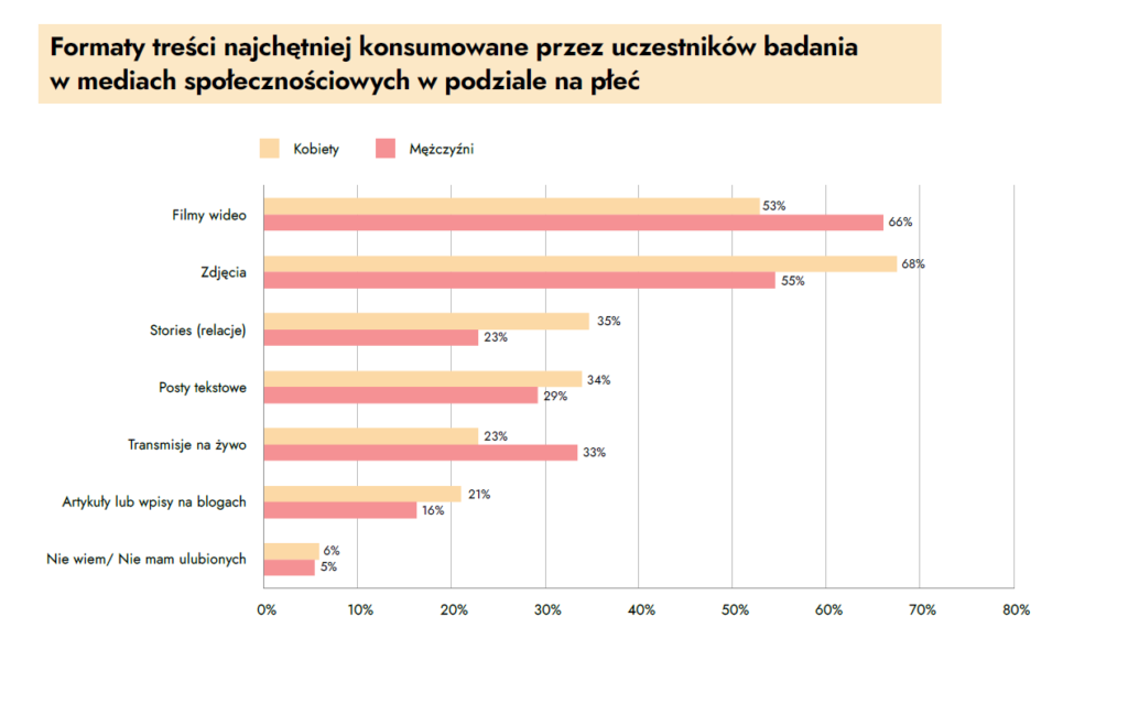 - Mężczyźni częściej wybierają zdjęcia, a także nieco chętniej niż kobiety oglądają relacje na żywo.