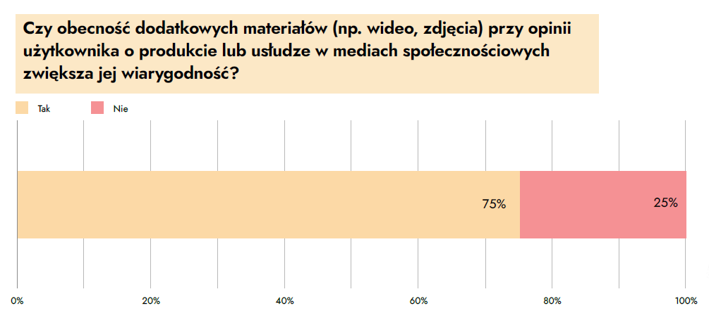 Na odbiór rekomendacji ogromny wpływ ma sposób ich przedstawienia. 75% respondentów wskazało, że obecność multimediów – takich jak zdjęcia, wideo czy krótkie prezentacje produktu – znacząco zwiększa wiarygodność opinii. Autentyczne, wizualne treści pozwalają użytkownikom szybciej ocenić produkt i łatwiej podjąć decyzję.