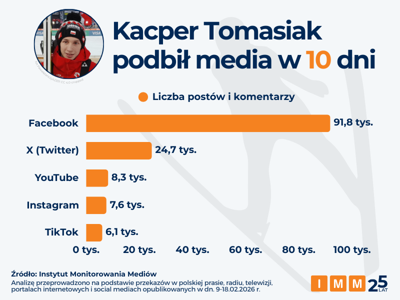 W badanym okresie od 9 do 18 lutego 2026 roku Kacper Tomasiak znalazł się w centrum zainteresowania polskich mediów. Jak podaje IMM, w mediach klasycznych odnotowano 20 320 publikacji, z czego blisko połowa (9 868) przypadła na radio. Na portalach internetowych ukazało się 6 991 publikacji, w telewizji 3 037 materiałów, a w prasie 424 artykuły.