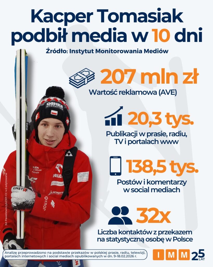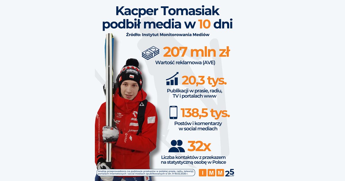 Ledwo opadły emocje po wyborze Sportowca Roku 2025, a w samym centrum zainteresowania marek i opinii publicznej stanął nowy bohater polskiego sportu. Sukcesy Kacpra Tomasiaka na Igrzyskach Olimpijskich wywołały w mediach prawdziwe tsunami. Z analizy Instytutu Monitorowania Mediów (IMM) wynika, że skoczek wygenerował ponad 207 mln zł ekwiwalentu reklamowego (AVE), a statystyczny Polak mógł zetknąć się z informacją o jego sukcesach aż 32 razy.