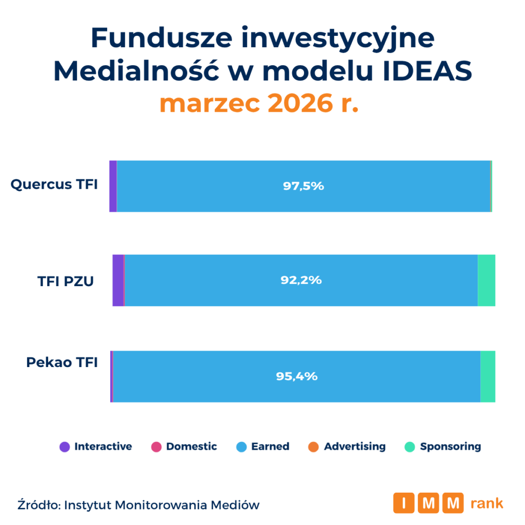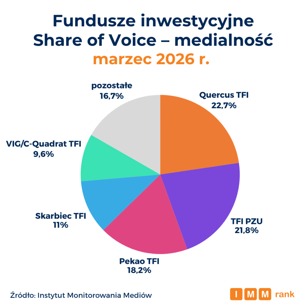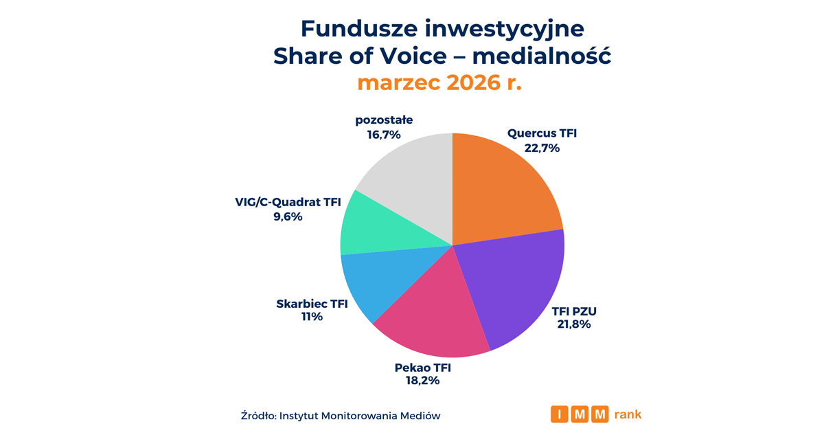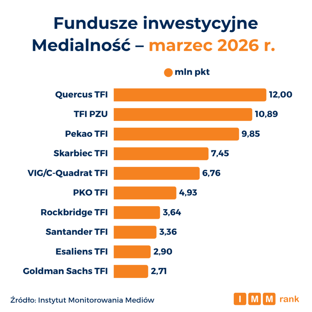 Na czele zestawienia najbardziej medialnych funduszy inwestycyjnych marca 2026 r. znalazły się Quercus TFI, TFI PZU oraz Pekao TFI – wynika z danych Instytutu Monitorowania Mediów (IMM). Zestawienie pokazuje, że przodujące w mediach fundusze inwestycyjne mają zbliżone strategie komunikacji zewnętrznej – wszystkie koncentrują się na współpracach redakcyjnych, a w znikomym stopniu wykorzystują reklamy i kanały własne.