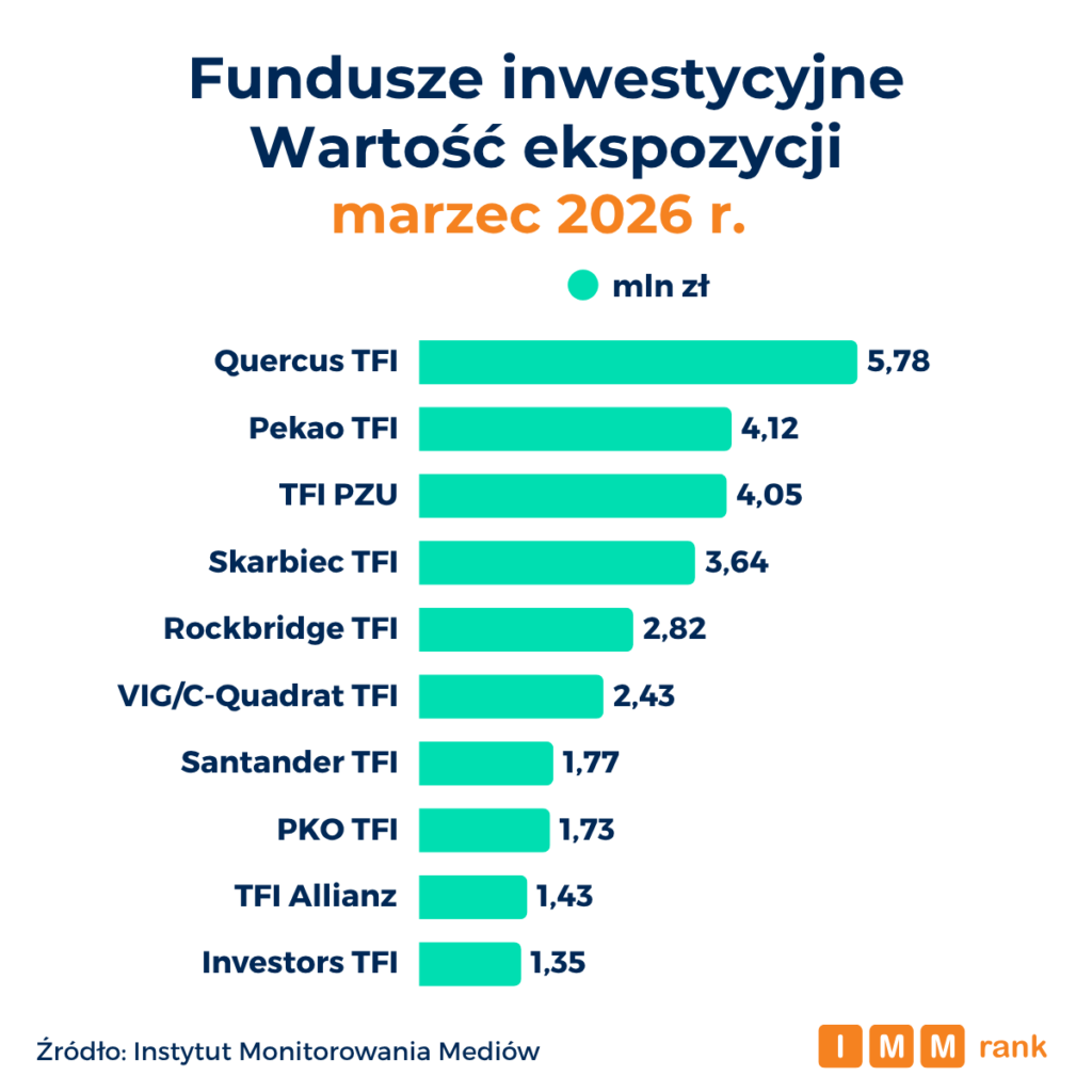 Pod względem wartości ekspozycji medialnej w marcu 2026 r. widać jeszcze większą przewagę lidera nad pozostałymi funduszami. Quercus TFI osiągnął wartość ekspozycji szacowaną na 5,78 mln zł. Wskaźnik ten wskazuje, ile kosztowałaby dana ekspozycja o podobnej powierzchni, czasie antenowym lub liczbie wyświetleń według oficjalnych cenników netto mediów i platform społecznościowych, bez uwzględniania pakietów, rabatów oraz aukcji. Na drugim miejscu znalazło się Pekao TFI z wynikiem 4,12 mln zł, a na trzecim TFI PZU – 4,05 mln zł.