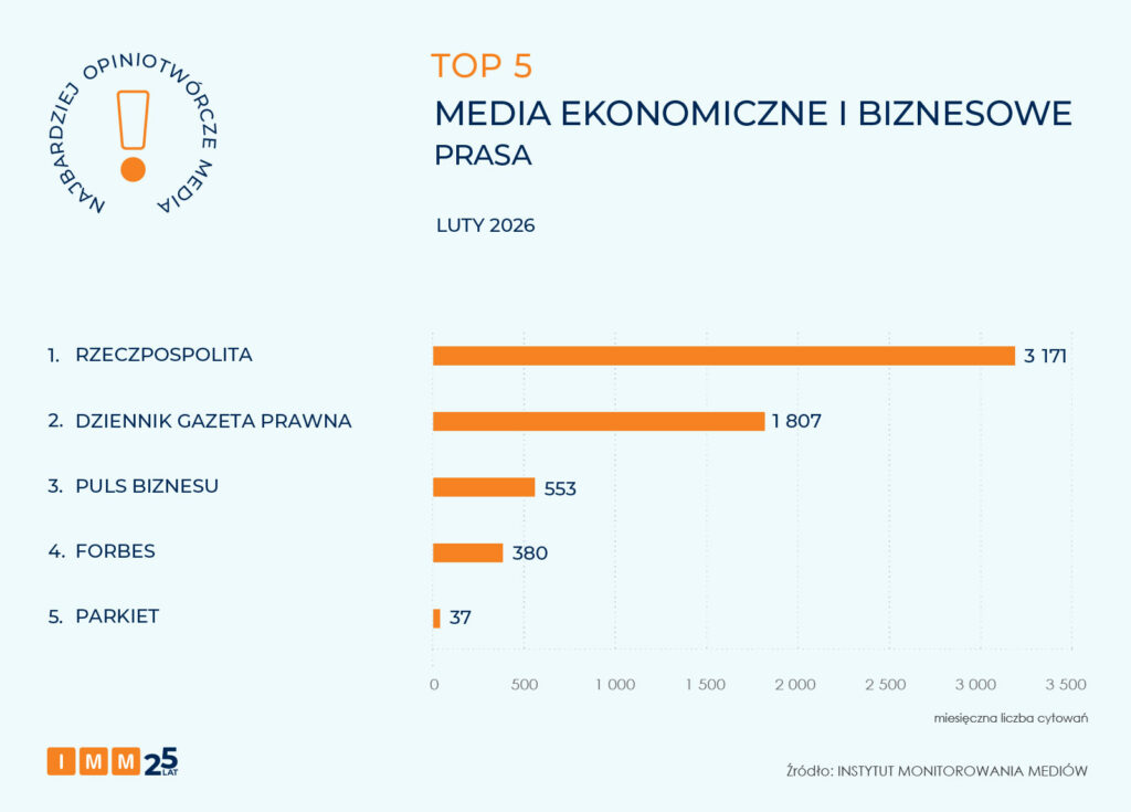 Ranking najbardziej opiniotwórczych tytułów prasowych o tematyce biznesowej otwiera „Rzeczpospolita”, osiągając wynik blisko 3,2 tys. cytowań.