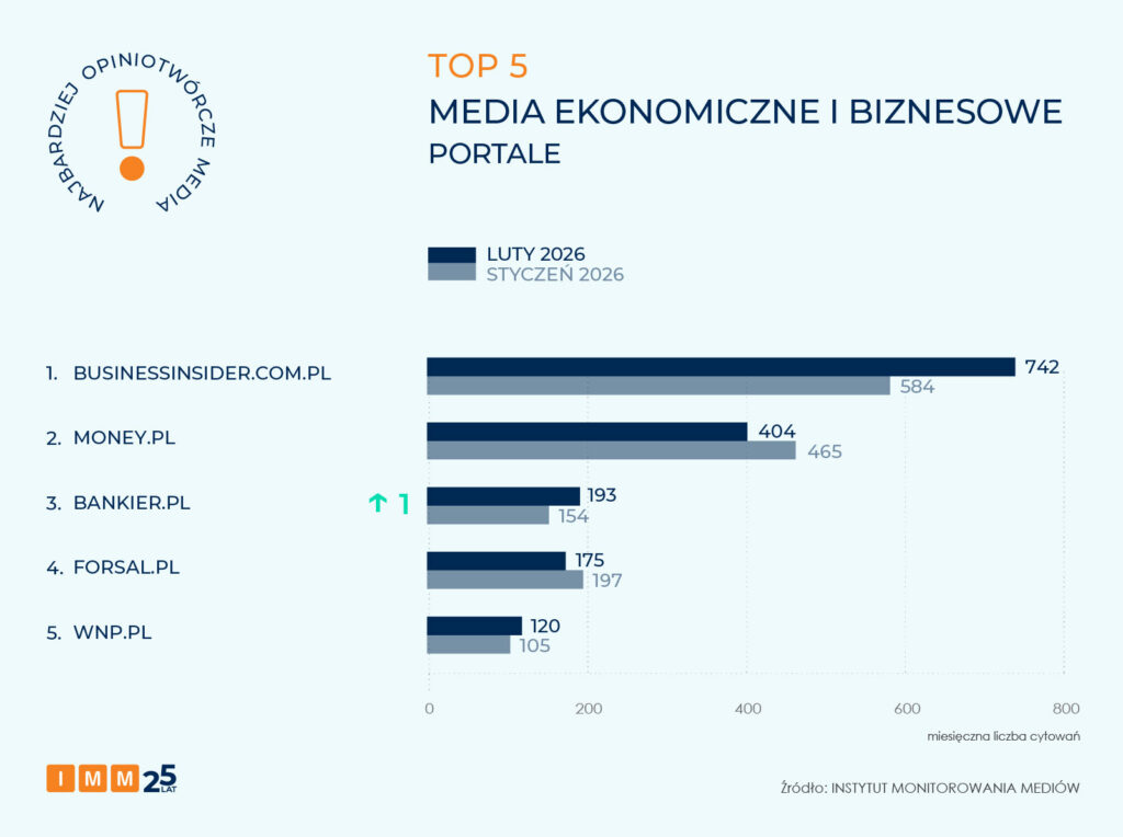 Zestawienie IMM najbardziej opiniotwórczych portali o tematyce ekonomiczno-biznesowej otwiera Business Insider, który wygenerował 742 cytowania. Serwis poinformował o planowanym przejęciu InPostu przez międzynarodowe konsorcjum inwestorów. W jego skład wchodzą fundusz Advent International, firma logistyczna FedEx wehikuł inwestycyjny A&R Investments oraz grupa finansowa PPF Group.
