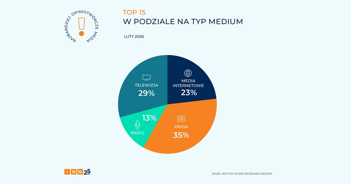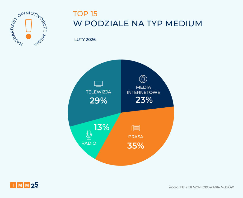 W lutowym zestawieniu TOP 15 najbardziej opiniotwórczych mediów w Polsce największy udział – 35% – zyskała prasa („Rzeczpospolita”, „Gazeta Wyborcza”, „Fakt”, „Dziennik Gazeta Prawna”, „Super Express”). 29% udziału należy do telewizji (TVN24, Polsat News, Eurosport, TVP Sport, TV Republika). Udziałem wynoszącym 23% mogą pochwalić się portale internetowe (Onet, Wirtualna Polska, Interia). Najmniejszy udział – wynoszący 13% – miały stacje radiowe (RMF FM, Radio ZET).