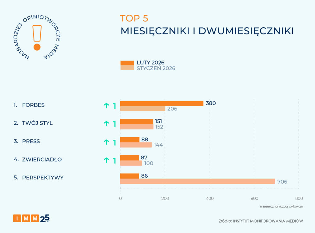 Zestawienie IMM najczęściej cytowanych miesięczników i dwumiesięczników lutego otwiera „Forbes”, który wygenerował 380 cytowań, głównie za sprawą opublikowanego rankingu 100 najbogatszych Polaków. Drugie miejsce należy do magazynu „Twój Styl” z wynikiem 151 cytowań. Na trzeciej pozycji znalazł się „Press” ze 88 powołaniami na źródło. Wszystkie magazyny awansowały o 1 miejsce w porównaniu z poprzednim rankingiem.