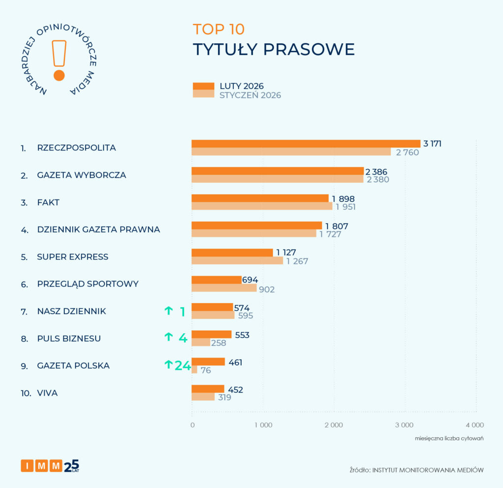 Najbardziej opiniotwórczym medium lutego została „Rzeczpospolita” z wynikiem 3,2 tys. odniesień w innych mediach. Na drugim miejscu – z 3 tys. powołaniami na źródło – znalazł się Onet. Podium zamyka TVN24, osiągając wynik 2,9 tys. cytowań – informuje Instytut Monitorowania Mediów (IMM) w najnowszym raporcie Najbardziej opiniotwórcze media w Polsce.