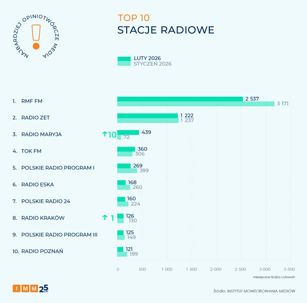 Pozycję lidera w rankingu najczęściej cytowanych stacji radiowych lutego utrzymało RMF FM, osiągając wynik ponad 2,5 tys. odniesień w mediach. Na antenie stacji były minister edukacji Przemysław Czarnek opowiadał m.in. o stanie zdrowia prezesa PiS Jarosława Kaczyńskiego i wyborze kandydata na premiera z ramienia partii (rozmowa została przeprowadzona przed ogłoszeniem Czarnka jako potencjalnego szefa rządu po wyborach parlamentarnych w 2027 roku).
