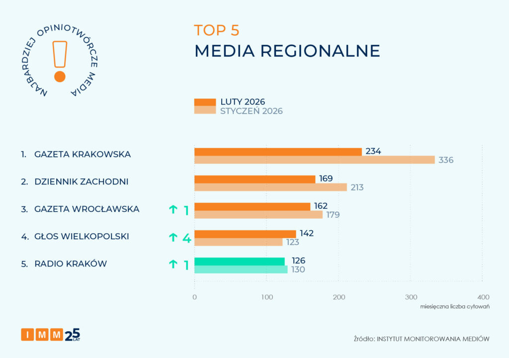 Zestawienie IMM najbardziej opiniotwórczych mediów regionalnych lutego otwiera „Gazeta Krakowska” (234 cytowania). Media przytaczały fragmenty rozmowy z aktorem Edwardem Linde-Lubaszenką, który zmarł 8 lutego.
