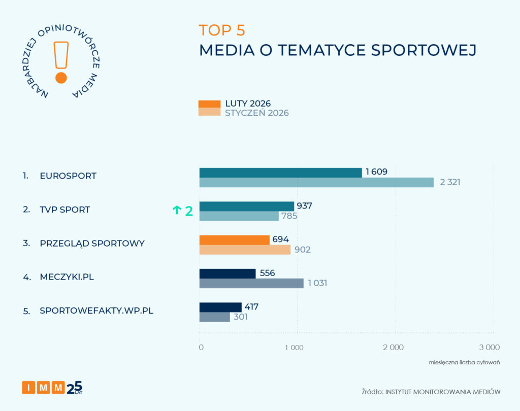 Najbardziej opiniotwórczym medium o tematyce sportowej w lutym został Eurosport, który osiągnął wynik ponad 1,6 tys. odniesień w innych mediach.
