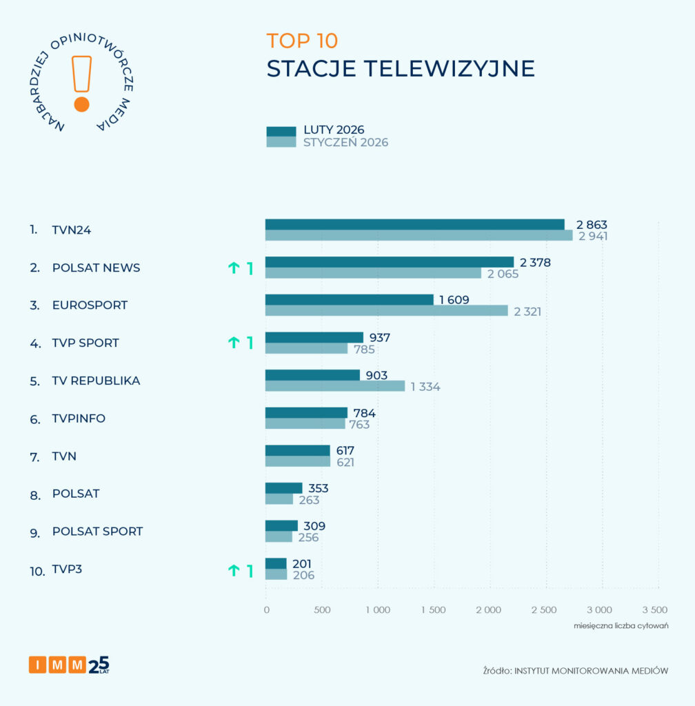 Najbardziej opiniotwórczą stacją lutego, osiągając wynik niemal 2,9 tys. odniesień, został TVN24. Na drugim miejscu – generując prawie 2,4 tys. cytowań i awansując o 1 pozycję – znalazł się Polsat News. Stacja przeprowadziła rozmowę z prezydentem Karolem Nawrockim, w której m.in. zapowiedział weto do ustawy o statusie osoby najbliższej.