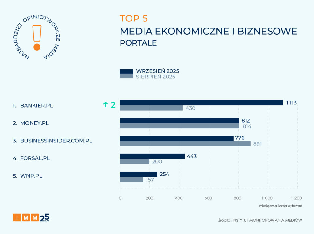 Zestawienie IMM najbardziej opiniotwórczych portali o tematyce ekonomiczno-biznesowej otwiera Bankier (awans o 2 pozycje), który wygenerował 1,1 tys. cytowań.