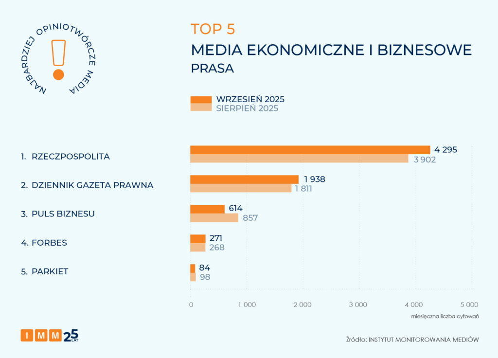Ranking najbardziej opiniotwórczych tytułów prasowych o tematyce biznesowej otwiera „Rzeczpospolita”, osiągając wynik ponad 4,3 tys. cytowań.