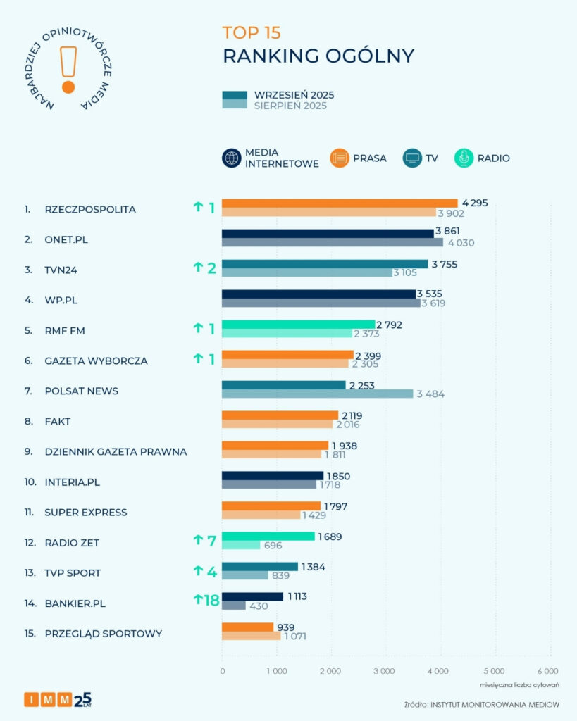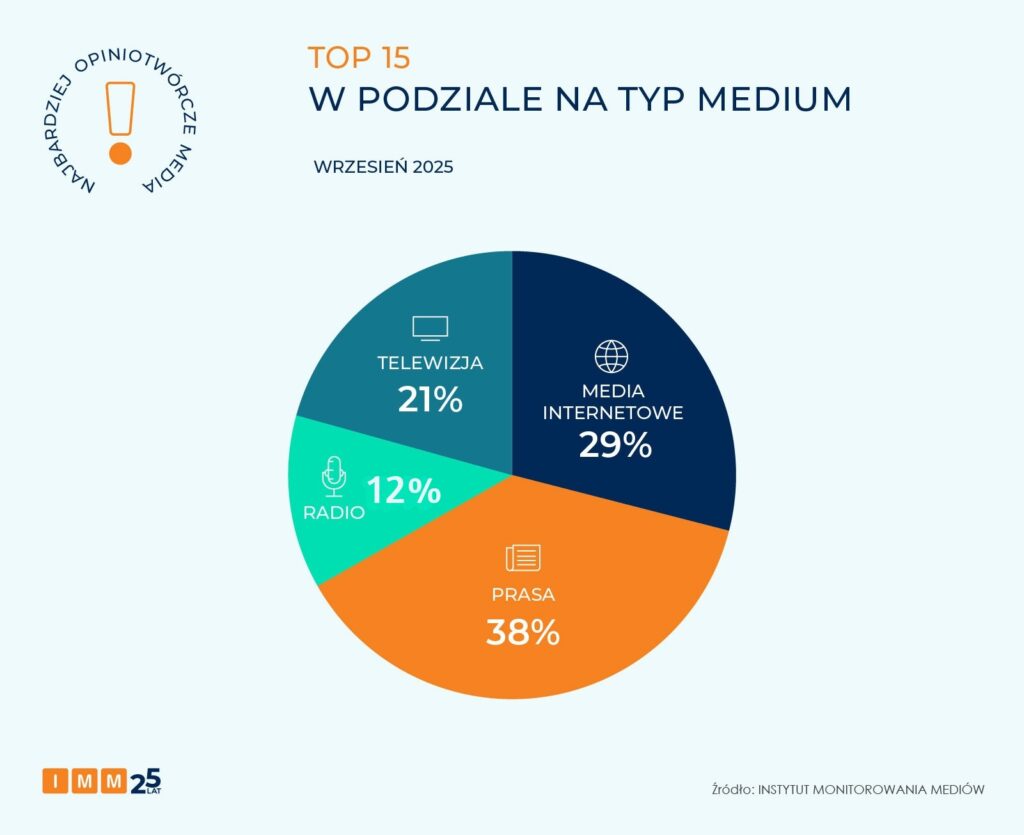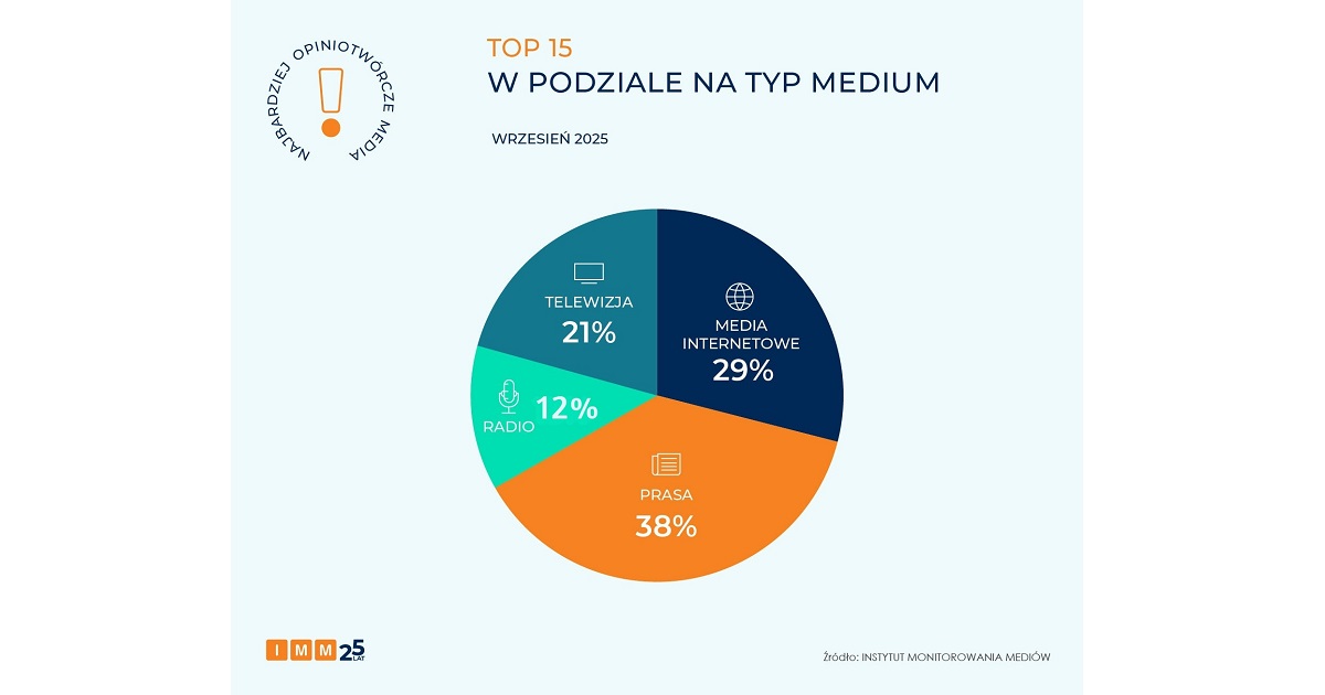 We wrześniowym zestawieniu TOP 15 najbardziej opiniotwórczych mediów w Polsce największy udział – 38% – uzyskała prasa („Rzeczpospolita”, „Gazeta Wyborcza”, „Fakt”, „Dziennik Gazeta Prawna”, „Super Express”, „Przegląd Sportowy”). 29% udziału należy do portali internetowych (Onet, Wirtualna Polska, Interia, Bankier). Udziałem wynoszącym 21% może pochwalić się telewizja (TVN24, Polsat News, TVP Sport). Najmniejszy udział – wynoszący 12% – miały stacje radiowe (RMF FM, Radio ZET).