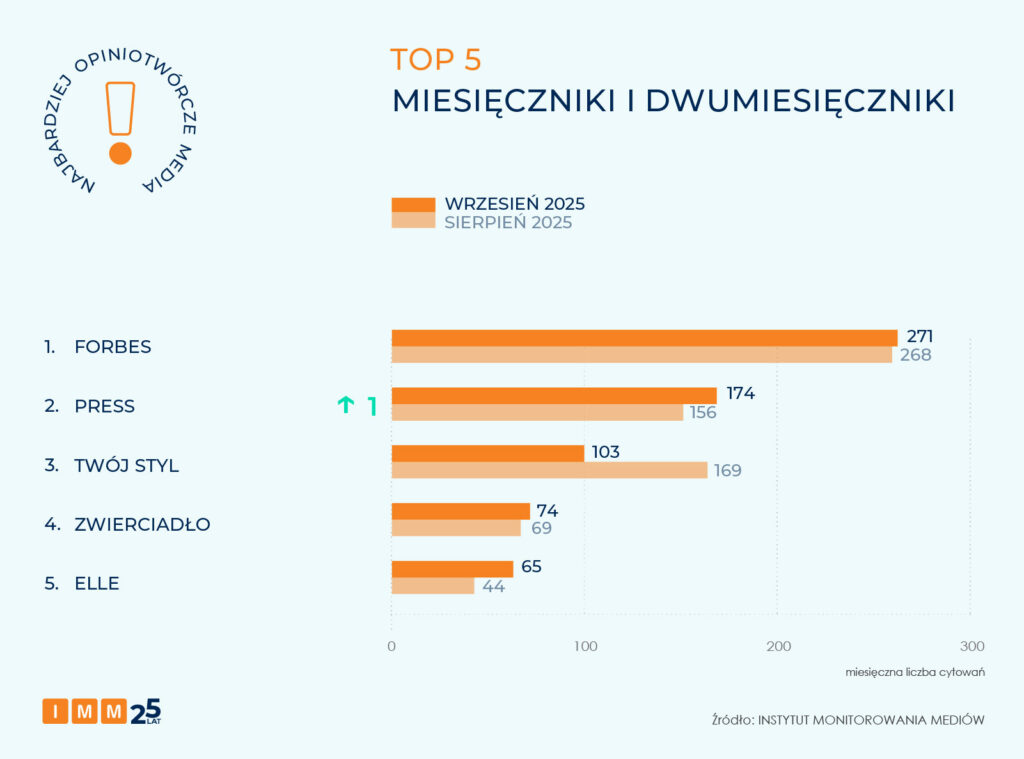 Zestawienie IMM najczęściej cytowanych miesięczników i dwumiesięczników września otwiera „Forbes”, który wygenerował 271 cytowań i utrzymał pozycję lidera. Redakcje opisywały przygotowane przez magazyn zestawienie „30 przed 30”, w którym znaleźli się młodzi liderzy polskiego biznesu.