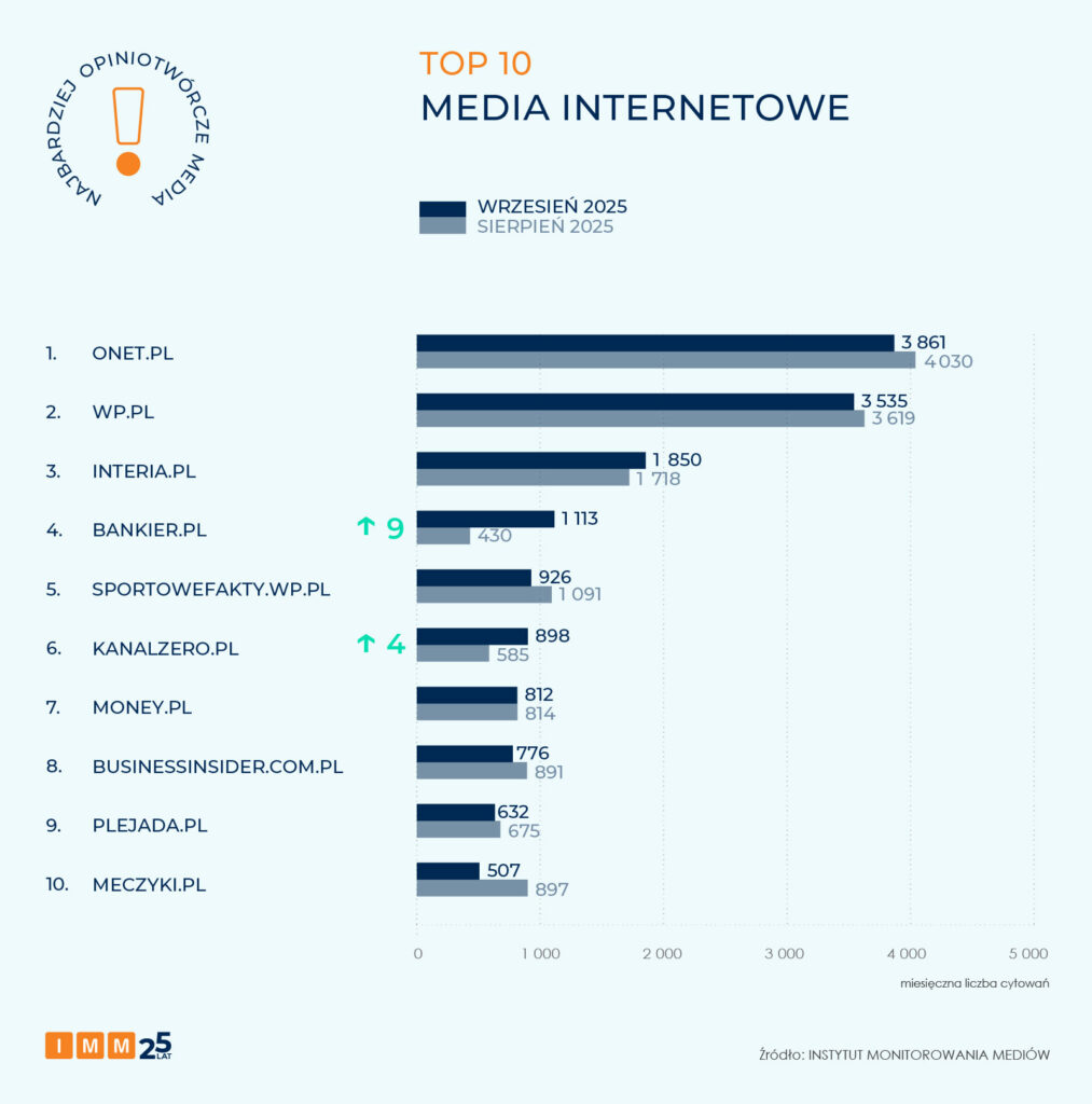 Awansem aż o 9 pozycji może pochwalić się Bankier, który wygenerował 1,1 tys. cytowań. O 4 pozycje awansował Kanał Zero (898 cytowań), który ogłosił, że były prezydent Andrzej Duda został nową twarzą projektu i poprowadzi własny program.