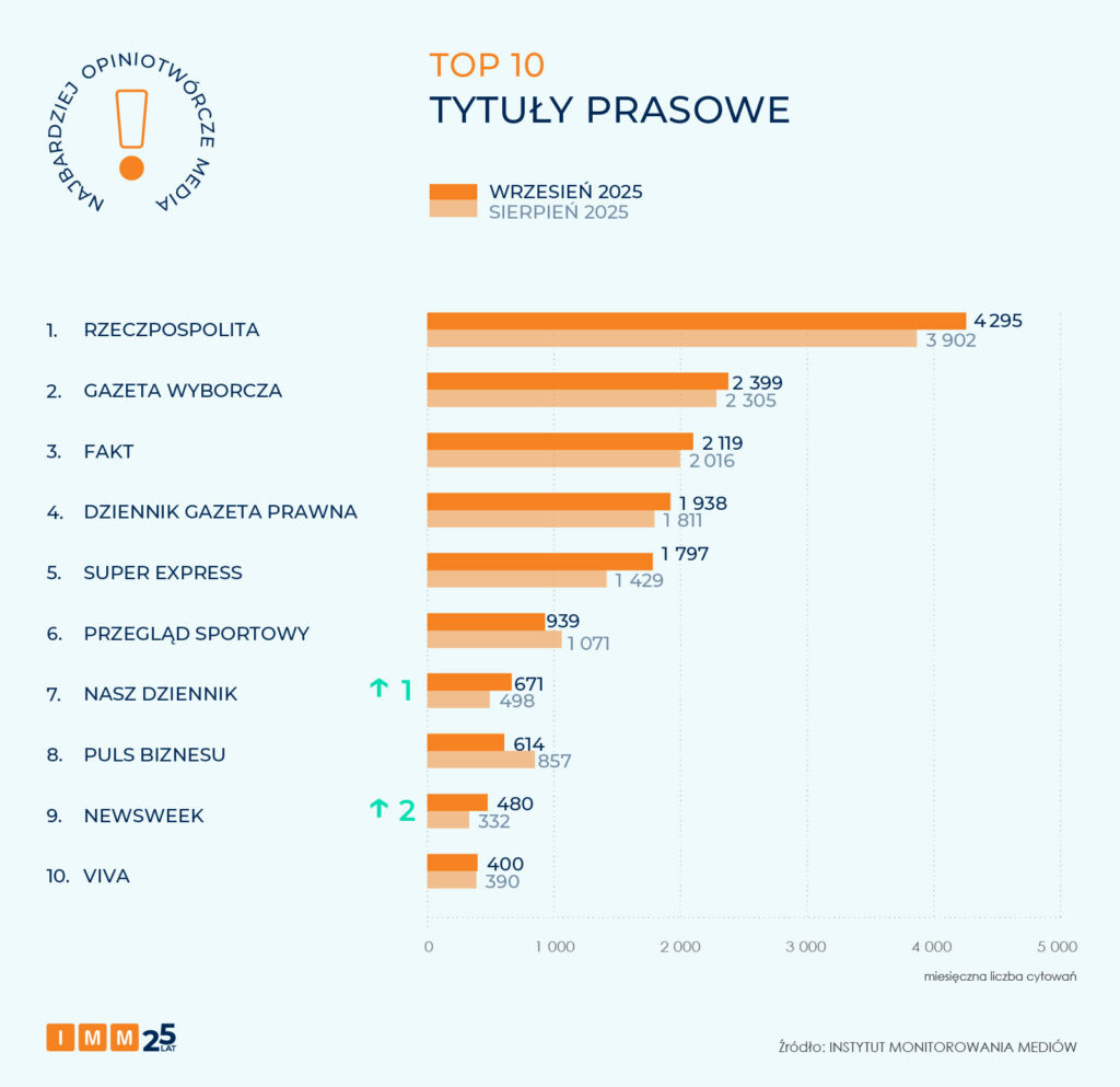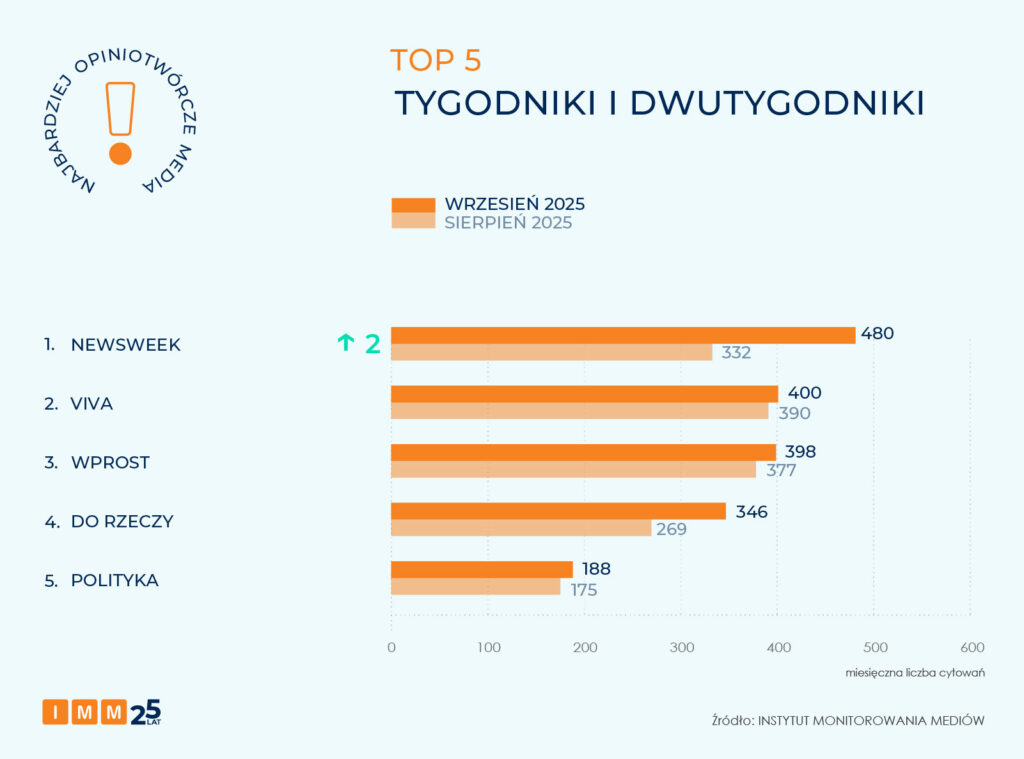 Podium najbardziej opiniotwórczych tygodników i dwutygodników otwiera „Newsweek” (awans o 2 pozycje), zdobywając we wrześniu 480 powołań na źródło m.in. dzięki ujawnieniu informacji o przedstawieniu przez prezydenta Nawrockiego swojej propozycji na zakończenie sporu o ambasadorów, która miała dotyczyć podziału placówek dyplomatycznych na „prezydenckie” i „rządowe”.