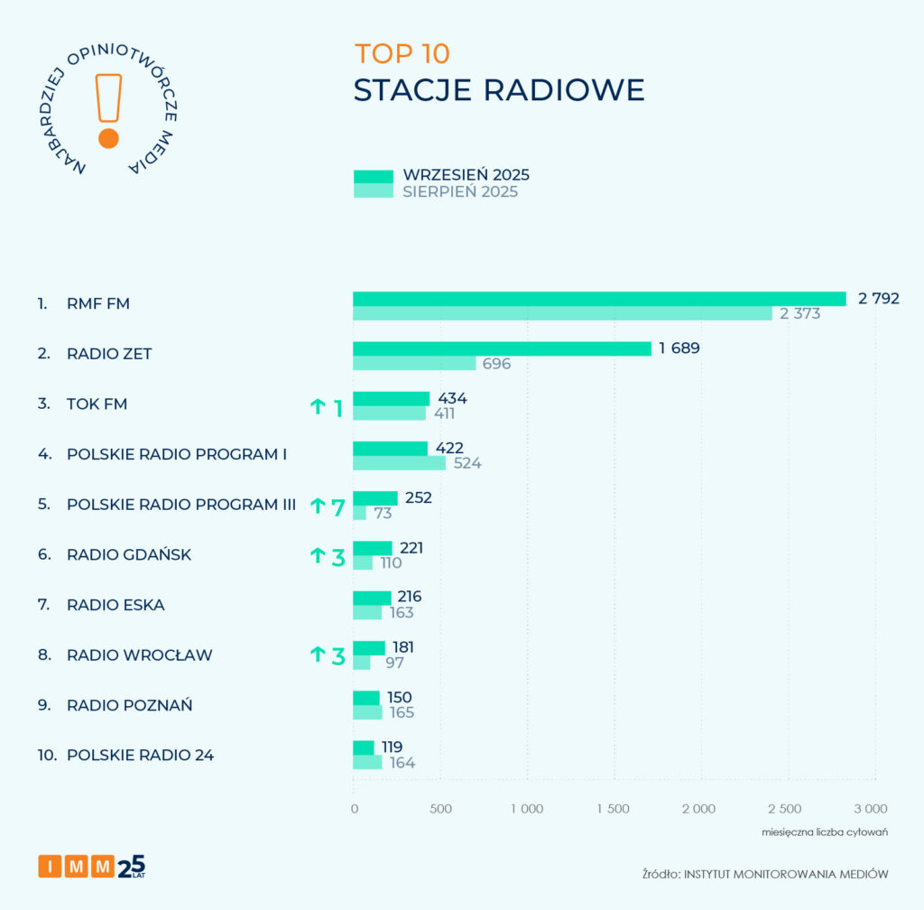 Pozycję lidera w rankingu najczęściej cytowanych stacji radiowych września utrzymało RMF FM, osiągając wynik niemal 2,8 tys. powołań na źródło. Rozgłośnia informowała o przesłaniu listu przez Donalda Trumpa do Karola Nawrockiego, który został przekazany za pośrednictwem ambasady Polski w USA.