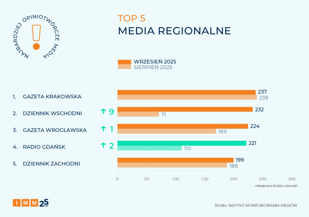 Zestawienie IMM najbardziej opiniotwórczych mediów regionalnych września otwiera „Gazeta Krakowska” (237 cytowań). Dziennik informował o niebezpiecznym incydencie na Giewoncie, gdzie trzy osoby wspięły się na krzyż znajdujący się na wierzchołku góry.