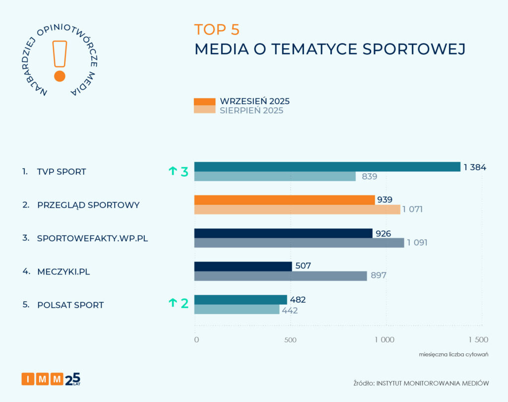 Najbardziej opiniotwórczym medium o tematyce sportowej we wrześniu został TVP Sport (awans o 3 pozycje), który osiągnął wynik blisko 1,4 tys. powołań w innych mediach.