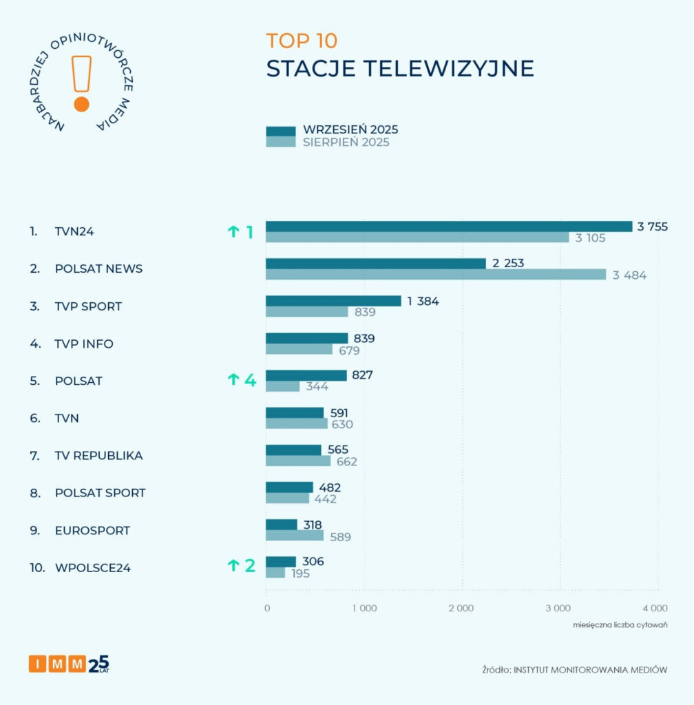 Najbardziej opiniotwórczą stacją września, osiągając wynik blisko 3,8 tys. cytowań i awansując o jedną pozycję, został TVN24.