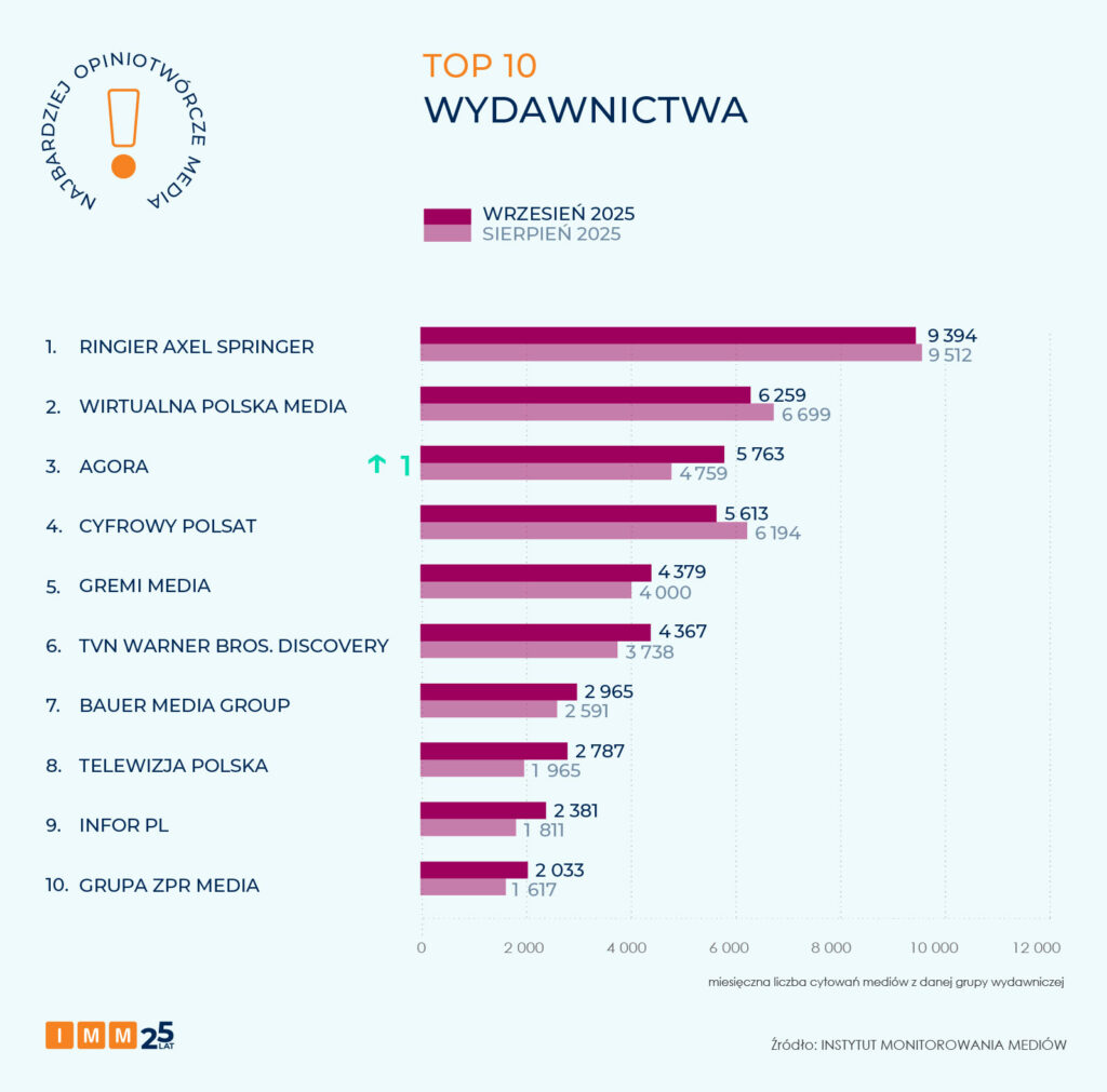 Pierwsze miejsce wśród najbardziej opiniotwórczych wydawnictw września utrzymuje Ringier Axel Springer Polska, którego redakcje Business Insider, „Fakt”, „Forbes”, Medonet, „Newsweek”, Noizz, Onet, Plejada i „Przegląd Sportowy” były cytowane przez dziennikarzy innych mediów w Polsce blisko 9,4 tys. razy.