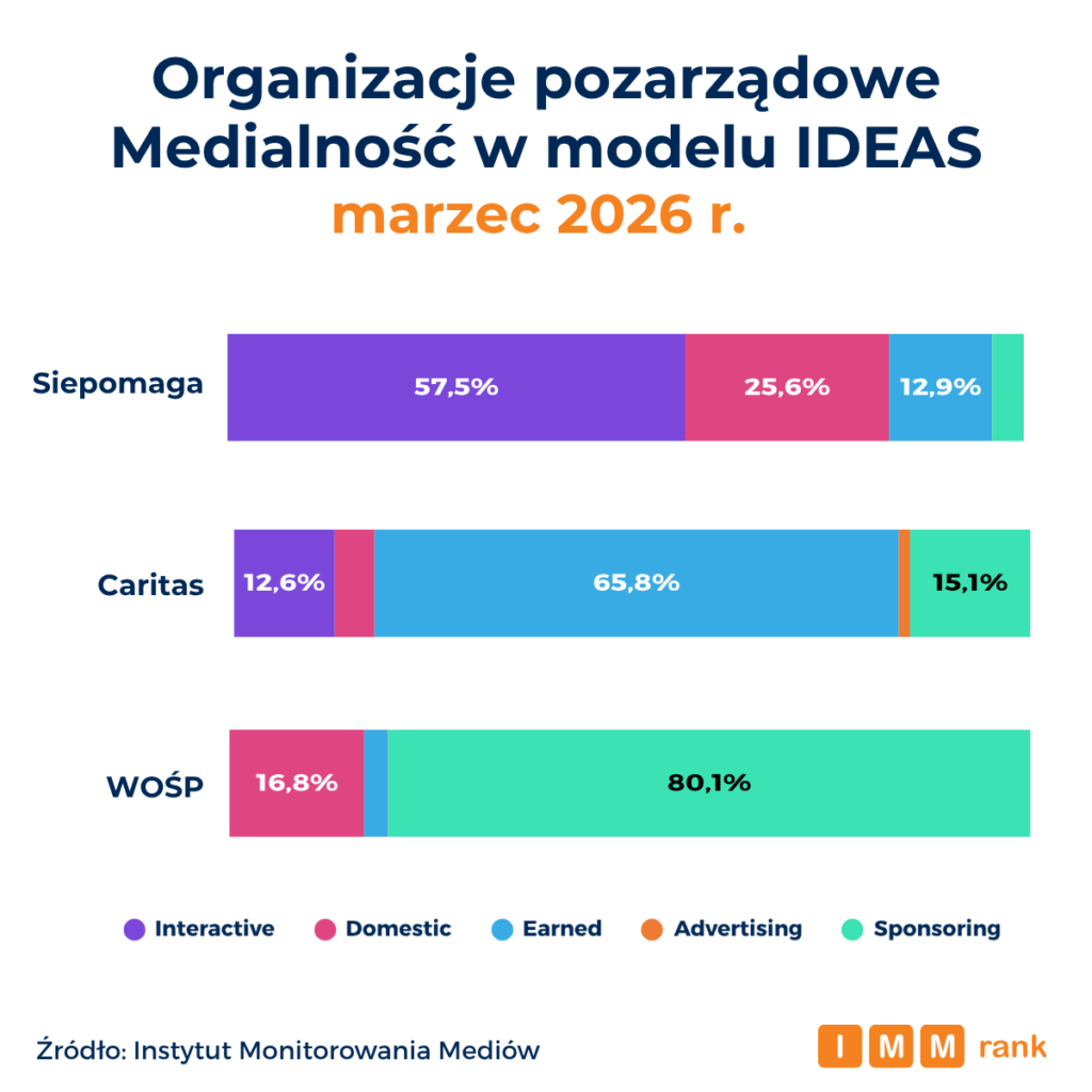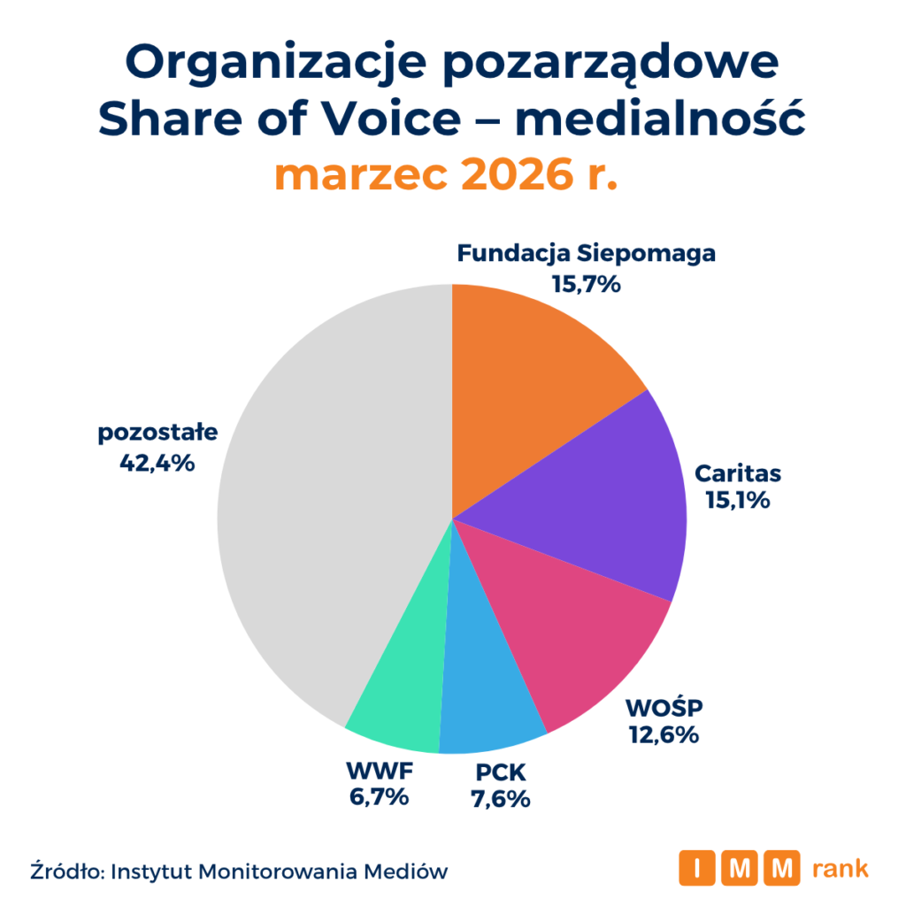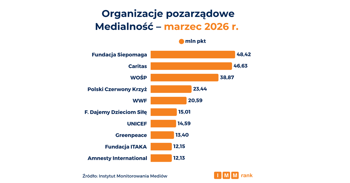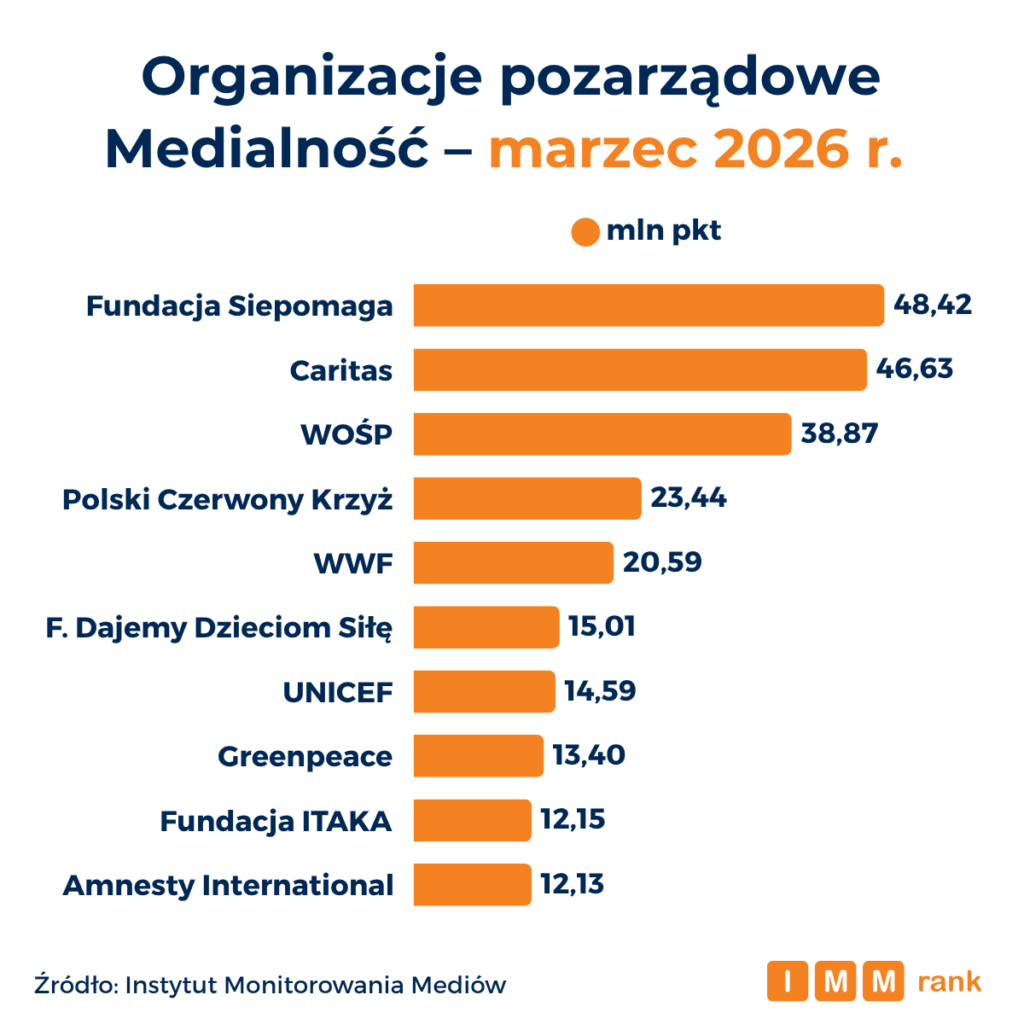 Fundacja Siepomaga, Caritas oraz Wielka Orkiestra Świątecznej Pomocy są na czele rankingu najbardziej medialnych organizacji pozarządowych marca 2026 r. – wynika z danych Instytutu Monitorowania Mediów (IMM). Zestawienie pokazuje bardzo zbliżony poziom obecności medialnej dwójki liderów oraz ujawnia zróżnicowane strategie promocyjne najpopularniejszych organizacji – od stawiania na silną obecność w social mediach, poprzez budowanie skutecznych relacji z mediami, aż po szerokie wykorzystanie partnerstw i działań sponsoringowych.
