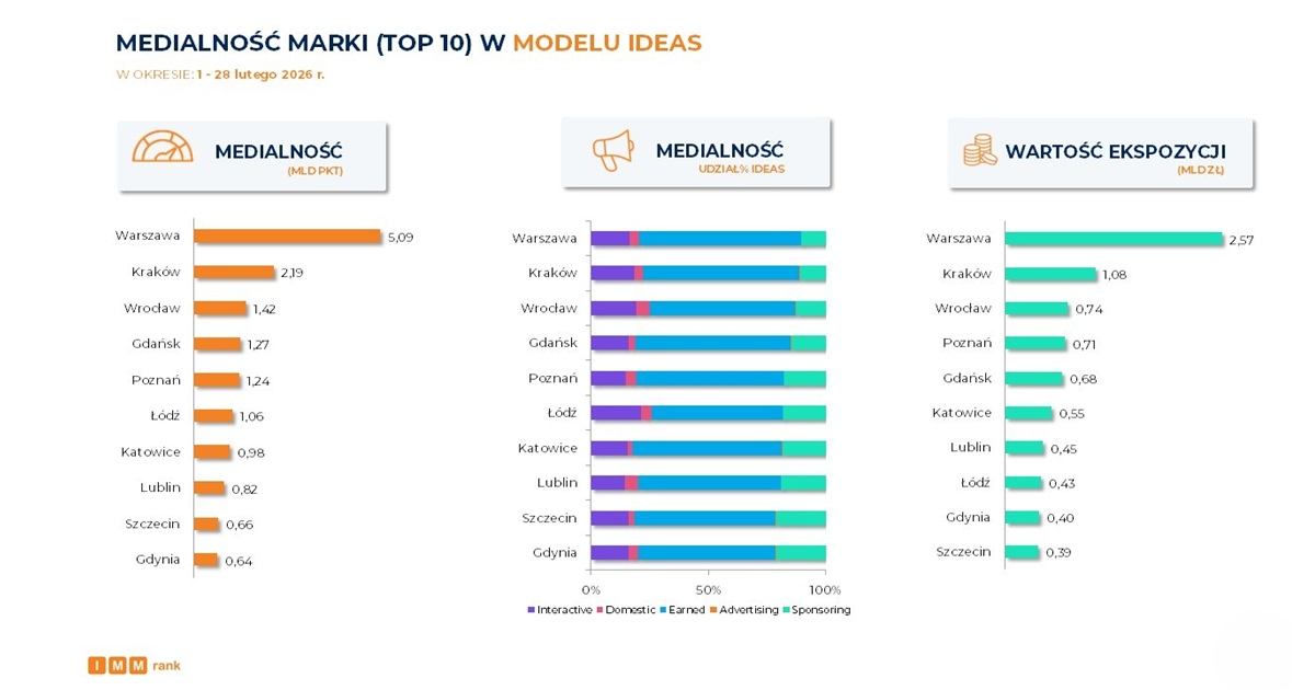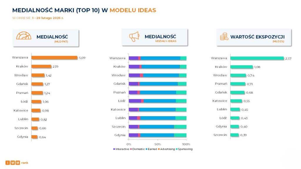 W okresie 1-28 lutego 2026 r. najwyższą medialność wśród miast uzyskała Warszawa z wynikiem 5,09 mld punktów. Warto zauważyć, że stolica zdobyła w zestawieniu więcej punktów niż trzy kolejne miasta łącznie (Kraków, Wrocław, Gdańsk). Najwyższy udział procentowy w modelu IDEAS wygenerował obszar Earned, na który składają się publikacje redakcyjne w prasie, radiu, telewizji i na portalach internetowych wzmiankujących miasto. Duży wpływ na wynik medialny marki miał również obszar Interactive, czyli publiczne posty i komentarze w mediach społecznościowych. Wysoki poziom medialności Warszawy wynika w dużej mierze z jej statusu stolicy, w której znajdują się najważniejsze instytucje państwowe, administracyjne i polityczne. Z tego względu miasto często pojawia się w przekazach dotyczących szerokiego spektrum tematów – nie tylko lokalnych, lecz także ogólnokrajowych, w tym szczególnie wydarzeń politycznych, decyzji rządowych czy debat publicznych.