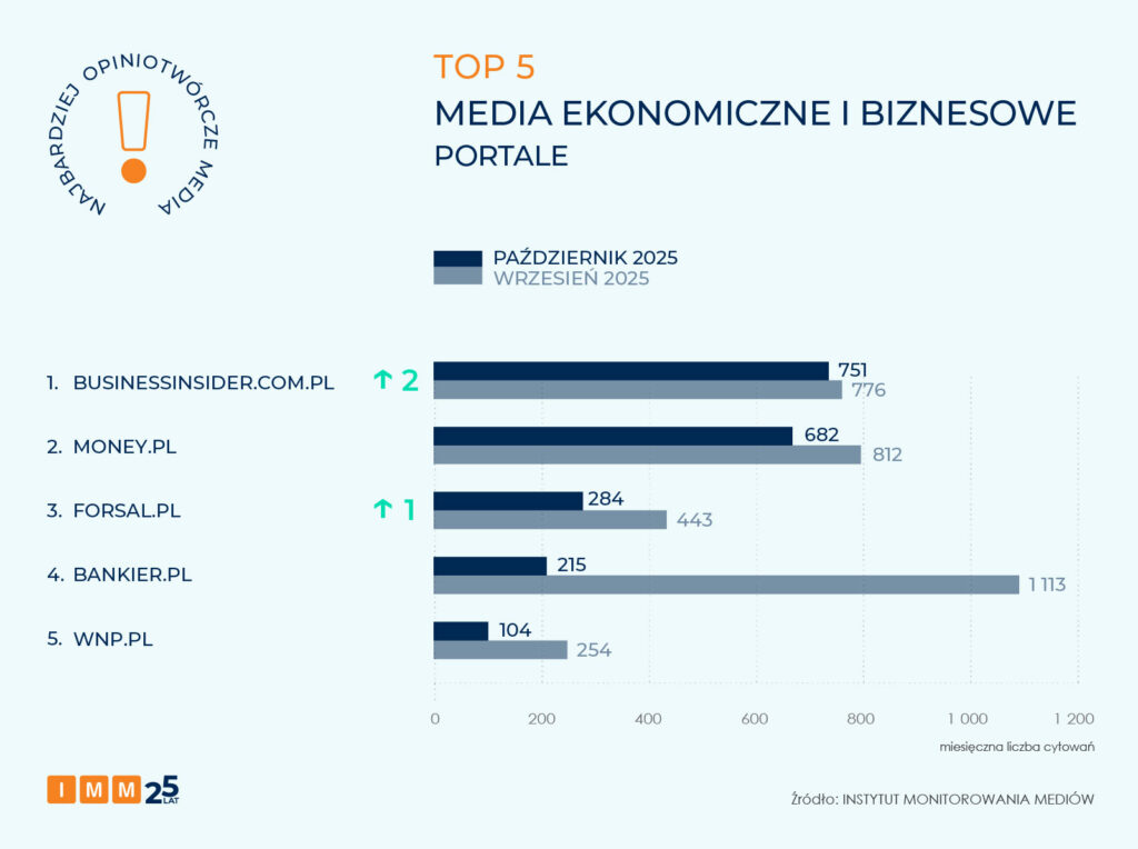 Zestawienie IMM najbardziej opiniotwórczych portali o tematyce ekonomiczno-biznesowej otwiera Business Insider (awans o 2 pozycje), który wygenerował 751 cytowań. Serwis opublikował komentarze ekspertów z branży handlowej dotyczące planów sprzedaży polskich sklepów Carrefour.