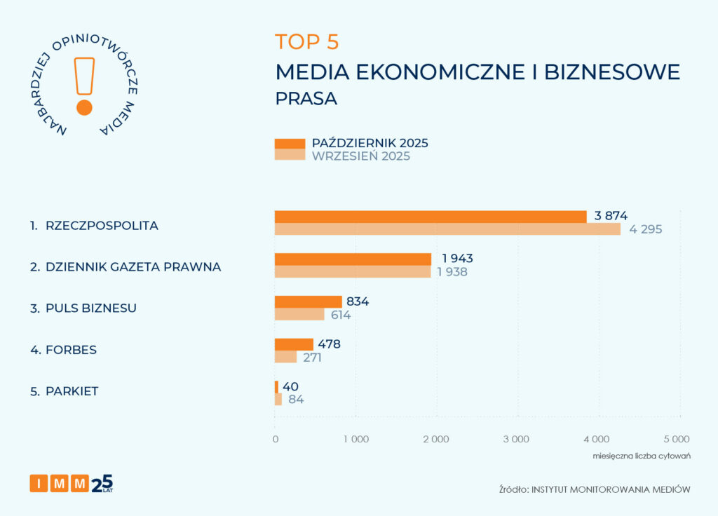Ranking najbardziej opiniotwórczych tytułów prasowych o tematyce biznesowej otwiera „Rzeczpospolita”, osiągając wynik ponad 3,9 tys. cytowań.