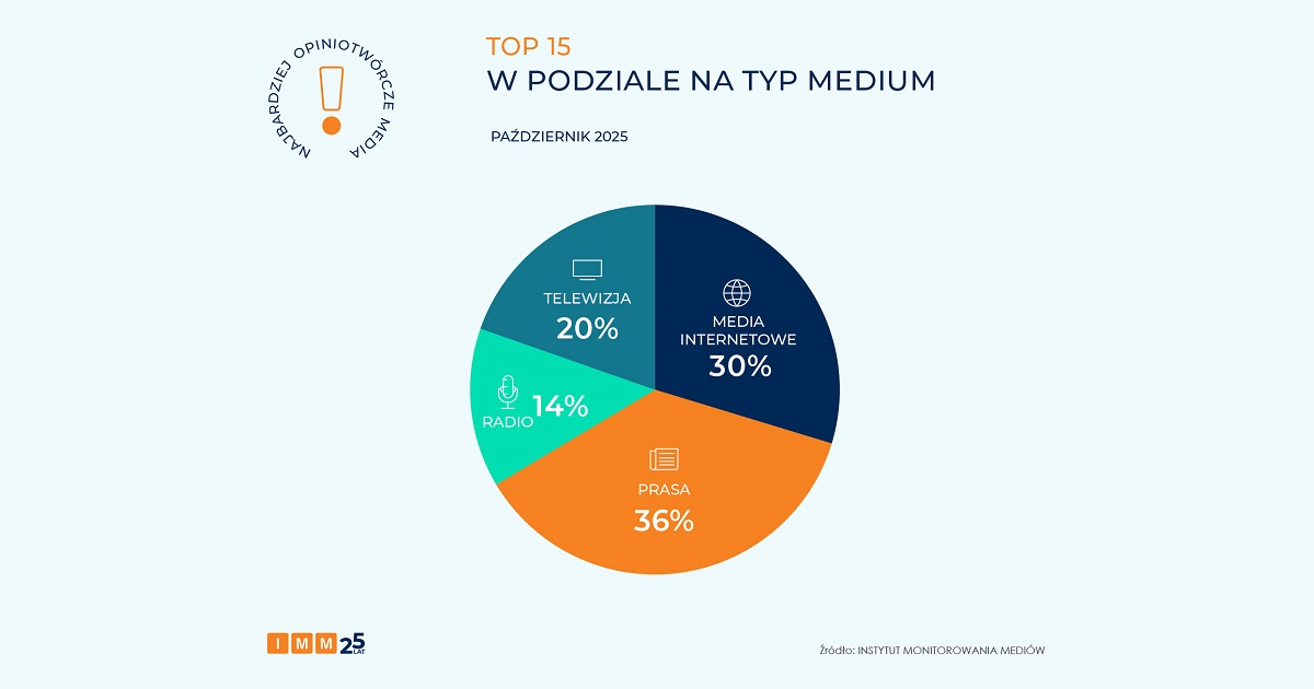 W październikowym zestawieniu TOP 15 najbardziej opiniotwórczych mediów w Polsce największy udział – 36% – uzyskała prasa („Rzeczpospolita”, „Gazeta Wyborcza”, „Fakt”, „Dziennik Gazeta Prawna”, „Super Express”, „Puls Biznesu”). 30% udziału należy do portali internetowych (Onet, Wirtualna Polska, Interia). Udziałem wynoszącym 20% może pochwalić się telewizja (TVN24, Polsat News, TVP Sport, TVP Info). Najmniejszy udział – wynoszący 14% – miały stacje radiowe (RMF FM, Radio ZET).
