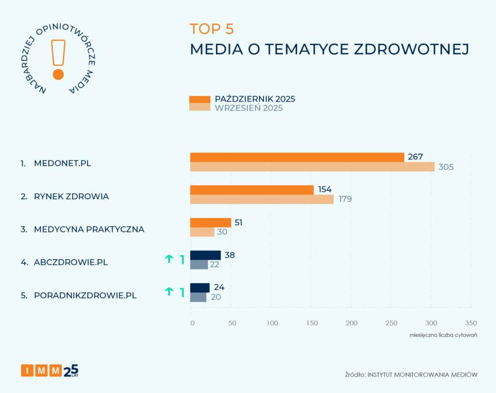 W rankingu najczęściej cytowanych mediów o tematyce medycznej pierwsze miejsce utrzymał Medonet, osiągając wynik 267 cytowań. Portal opisał zmiany na liście refundacyjnej oraz reakcje branży farmaceutycznej na wprowadzenie systemu kaucyjnego, który od 1 października obowiązuje również w aptekach.