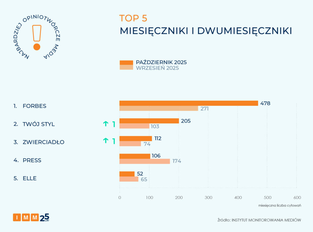 Zestawienie IMM najczęściej cytowanych miesięczników i dwumiesięczników października otwiera „Forbes”, który wygenerował 478 cytowań i utrzymał pozycję lidera. Magazyn ogłosił, że Elon Musk jako pierwszy w historii posiada majątek o wartości pół biliona dolarów netto.